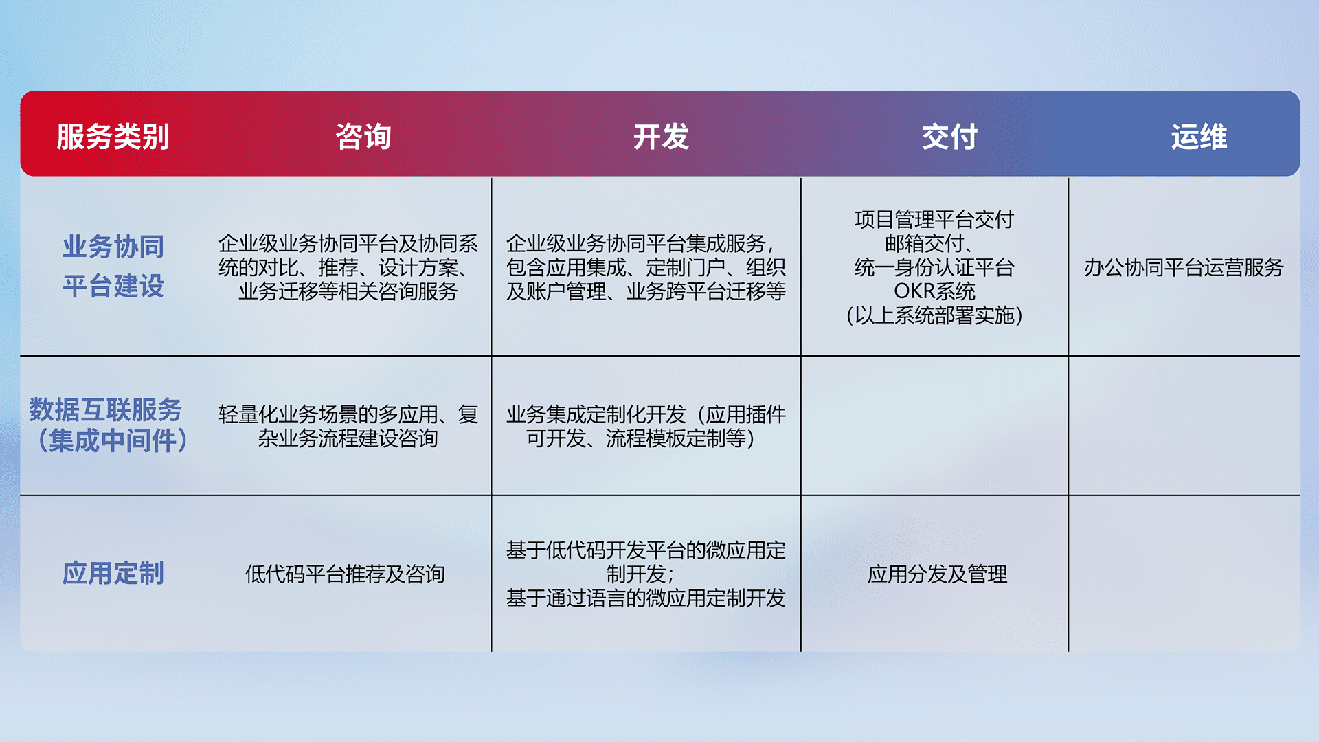 针对钉钉、、、、企微、、IDaas等平台级产品提供产品的规划、、、方案、、、、交付、、定制化开发等服务,,实现如统一协同办公、、智能客户服务、、、、混合会议管理、、、、智能数据查询、、、、等业务场景,,,实现数字化转型。。